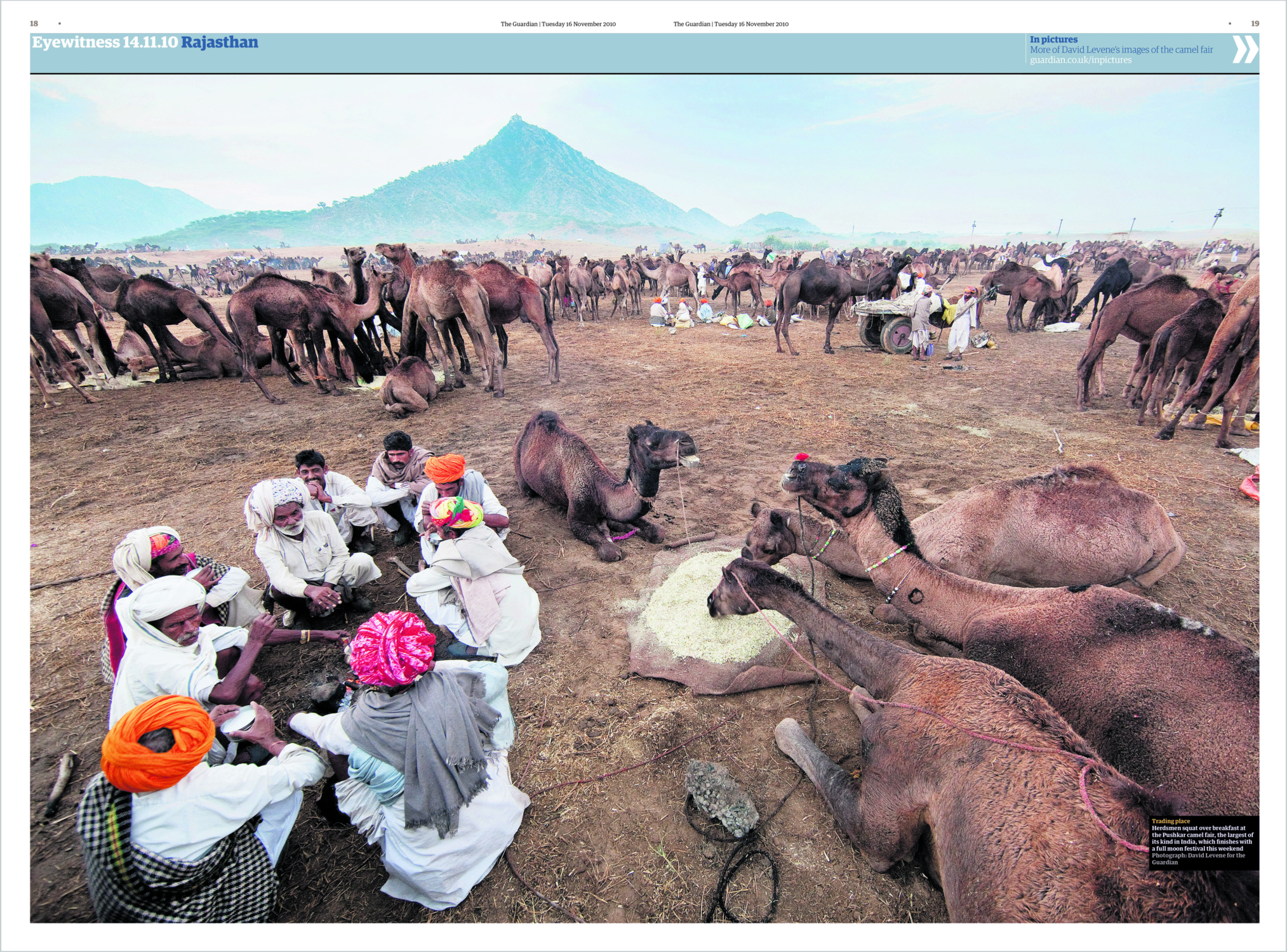 Herdsmen squat over breakfast at the largest camel fair, finished with a full moon festival, Pushkar, India, 2010